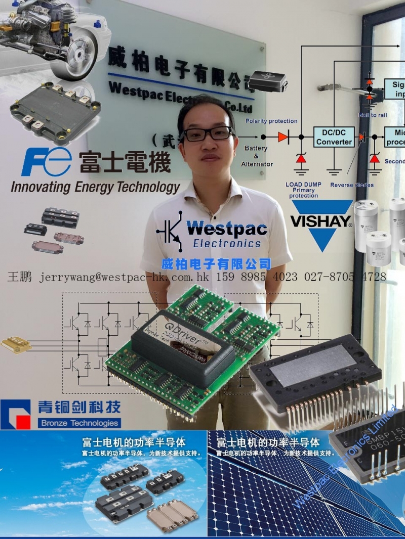 Westpac威柏针对工业电力电子领域以FUJI ELECTRIC富士电机IGBT模块(包括富士IPM模块、富士PIM模块、FUJI富士IGBT驱动IC)为核心,威柏配合国际知名品牌功率器件:富士IGBT驱动器,富士IGBT驱动器解决方案,富士IGBT模块专用驱动,富士IGBT模块定制驱动晶闸管,WESTPAC威柏-可控硅SCR、WESTPAC威柏-电力MOSFET、WESTPAC威柏-MOSFET模块,WESTPAC威柏-电力二极管、WESTPAC威柏-二极管模块、单相整流桥、叁相整流桥等。Westpac威柏同时可以为客户提供IGBT驱动方案及配套单片机MCU、DSP、高速光耦、隔离光耦、电源IC、平波用铝电解电容及薄膜电容、IGBT突波吸收电容等元件。业务遍及轨道交通、智能电网(HVDC)、通用变频器、高压变频器、伺服驱动器 、UPS、变频与传动、电动汽车、电力系统无功补偿装置UPS逆变器/UPS/EPS、风电变流器、变频空调、光伏变流、机车主牵引变流器、电梯变频器 、起重专用变频器 、 感应加热、电源电镀/电解电源 、有源滤波/无功补偿、机车辅助逆变器、逆变焊机;Westpac威柏在电能质量(APF,SVG)、逆变焊机、不间断电源UPS、Inverter变频器、数控伺服、电动汽车、风力太阳能发电等领域与客户战略合作,全力支持中国电力电子工业发展!